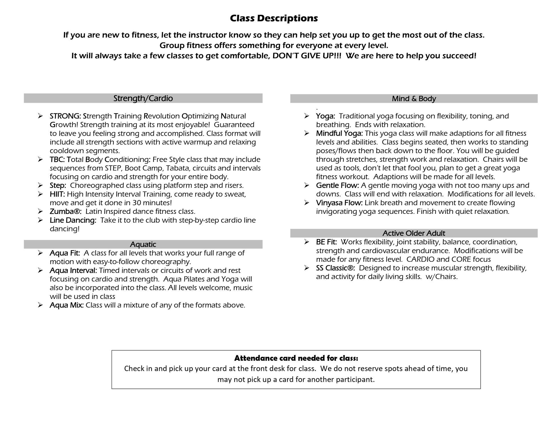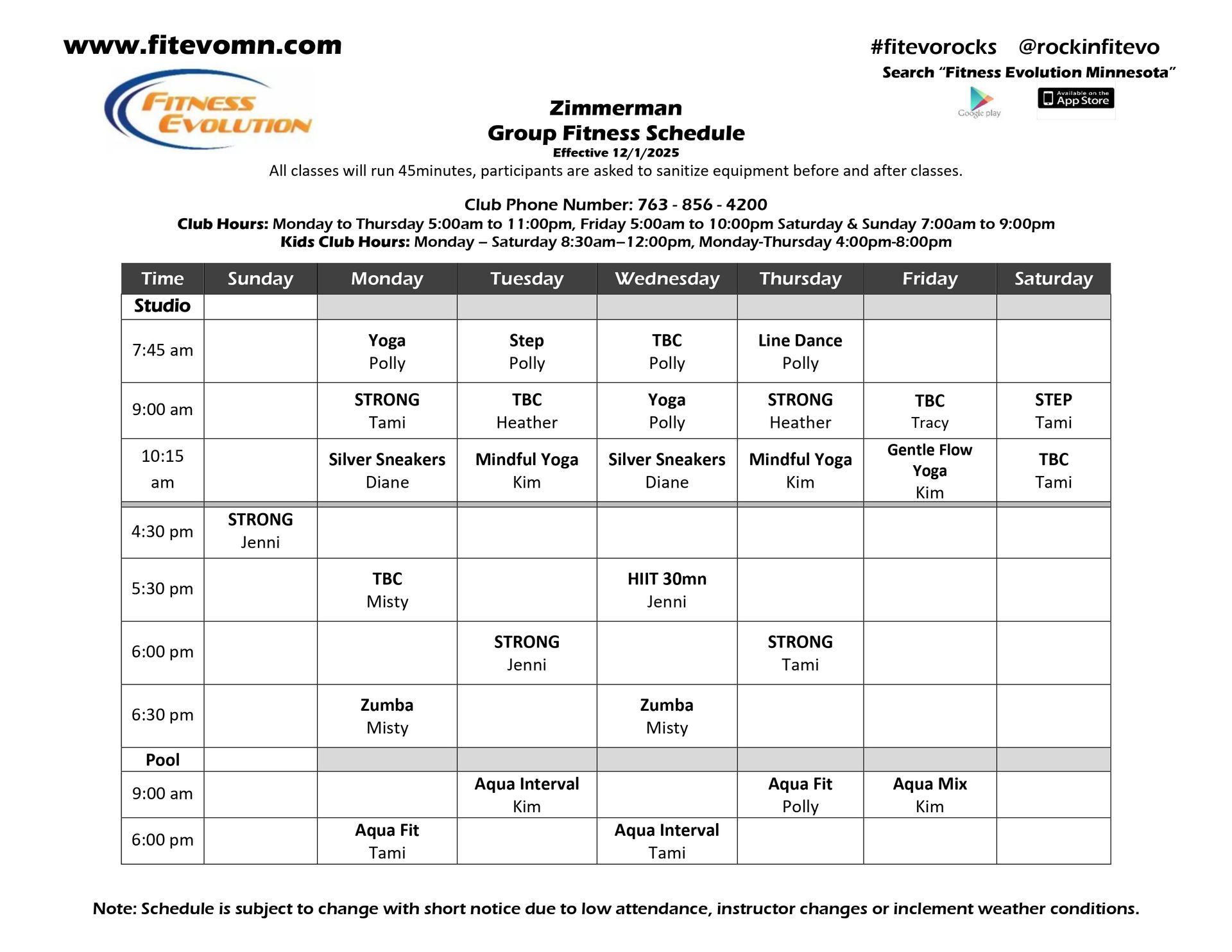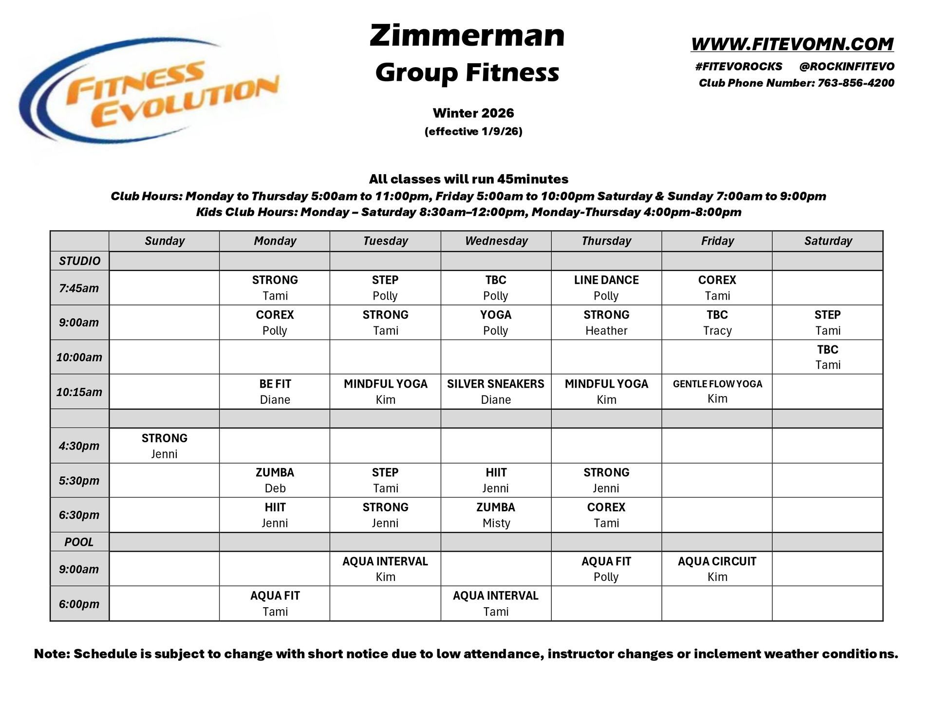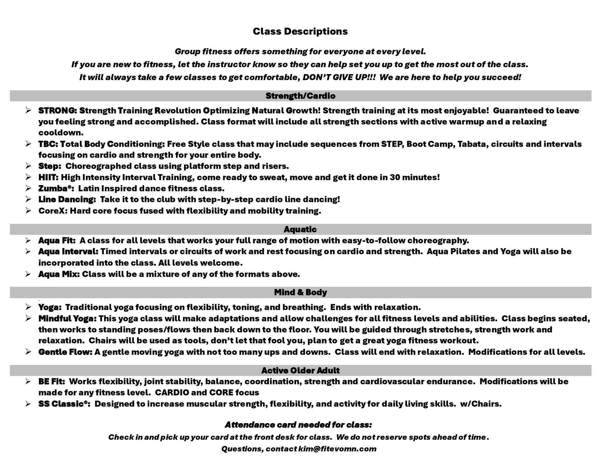 NOTE: Fitness classes schedule is subject to change due to low attendance or inclement weather conditions.